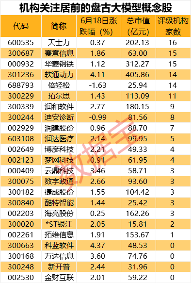 盘古大模型概念股多数获得机构关注,超过四成概念股获得5家及以上机构评级,天士力、赛意信息、华菱钢铁评级家数居前,均在15家及以上。