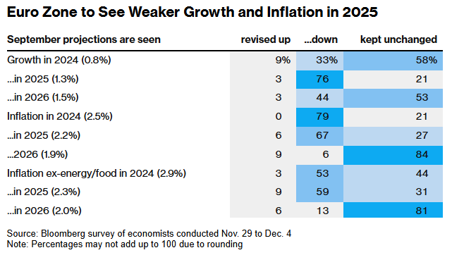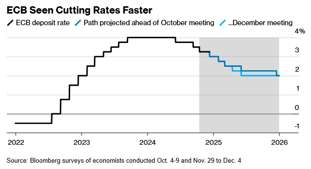 在这种背景下,政策制定者们倾向于逐步降低借贷成本。欧洲央行将在周四公布利率决议的同时公布新的季度预测,这些预测可能表明,2025年欧元区通胀和经济都将走弱。