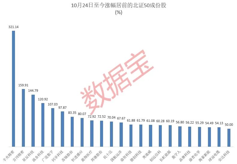 证券时报·数据宝对北证50指数成份股进行了梳理。从股价表现来看,多只成份股自10月24日以来录得巨大涨幅,23股涨逾50%,其中丰光精密、吉冈精密、星辰科技、流金科技、广道数字5股均已翻倍。