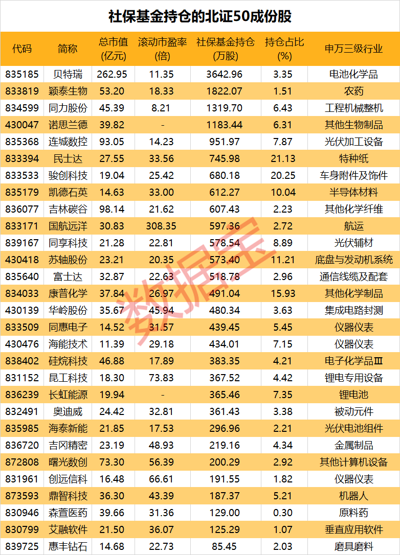 从基金持仓来看,截至三季度末,共计29只北证50成份股获社保基金持仓。