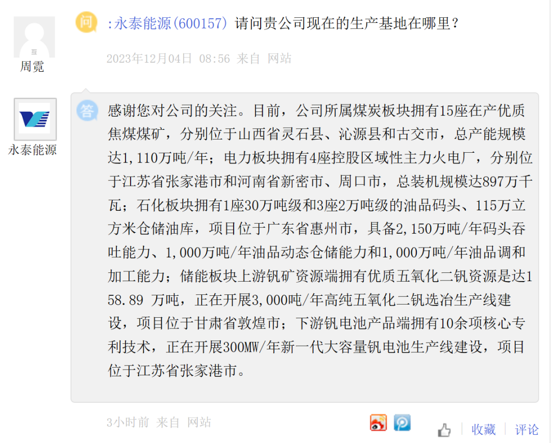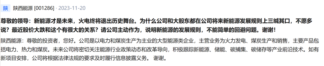 陕西能源则表示,公司是以电力和煤炭生产为主业的大型能源类企业,主营业务为火力发电、煤炭生产和销售,主要产品包括电力、热力和煤炭。未来公司将密切关注能源行业政策动态和改革导向,积极跟踪新能源、储能、碳捕集、碳储存等产业前沿技术。