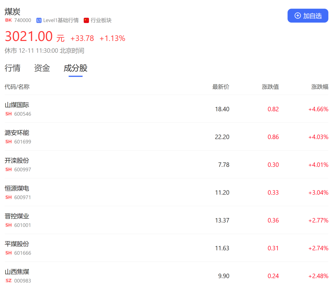 煤炭股早盘短暂探底后快速拉升,仅约半个小时,板块指数由跌逾1%转为涨超1%。山煤国际、潞安环能、开滦股份、恒源煤电等涨幅居前。港股金马能源、蒙古能源等相关煤炭股也逆势走强。