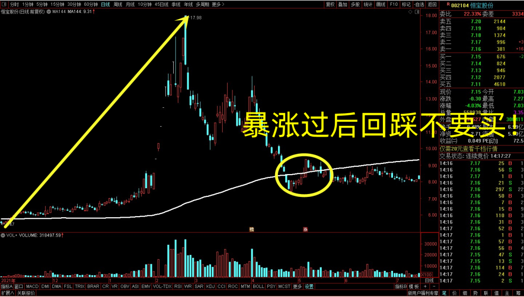 所以这种暴涨过的股票,即使是回调144均线,也不会买入。