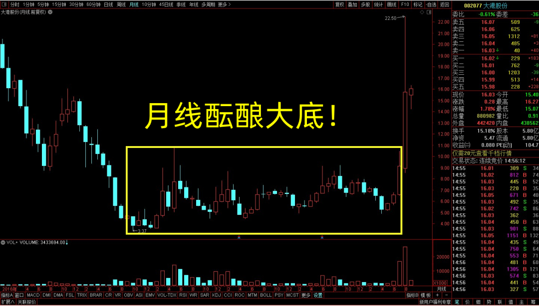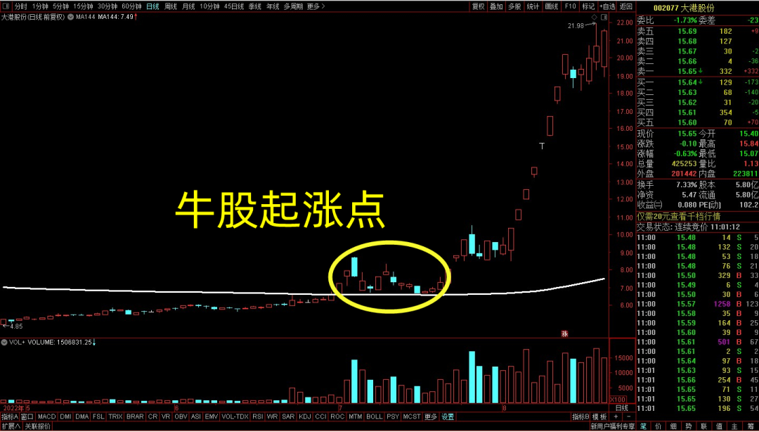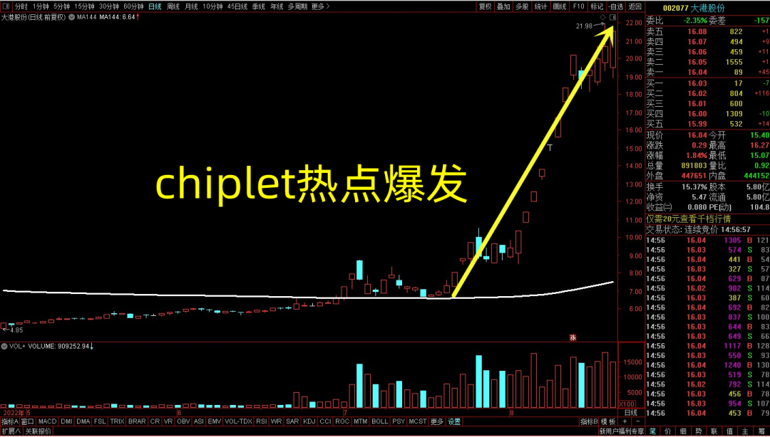 就比如去年的大港股份,在大涨之前,月线已经形成稳固的底部形态;而8月chiplet概念爆发,日线图在突破114均线后回踩不破,成功起飞。