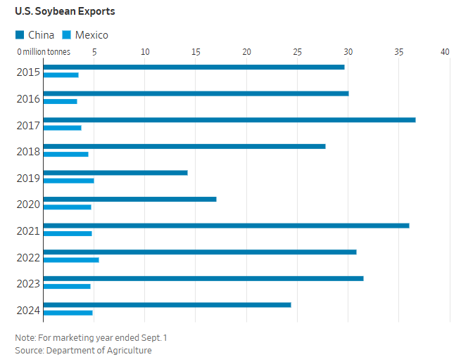 墨西哥是美国玉米的主要买家,购买的美国玉米出口量甚至还要超过中国。大豆方面的情况则恰恰相反——在2023/24销售年度,中国购买了约2440万吨美国大豆,而墨西哥仅购买了480万吨。