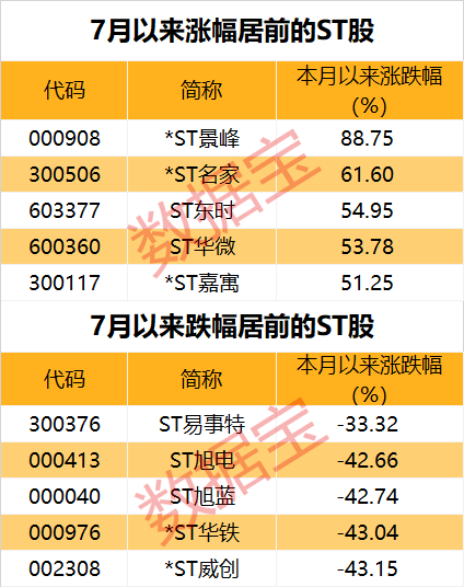 值得注意的是,7月以来持续涨停的ST股中,多股上半年业绩有继续亏损的风险。根据公司披露的半年报业绩预告,*ST景峰、ST东时、*ST龙津3股预告净利润中值均为负,其中*ST景峰一季报盈利后半年报再度转亏,ST东时同比由盈转亏。