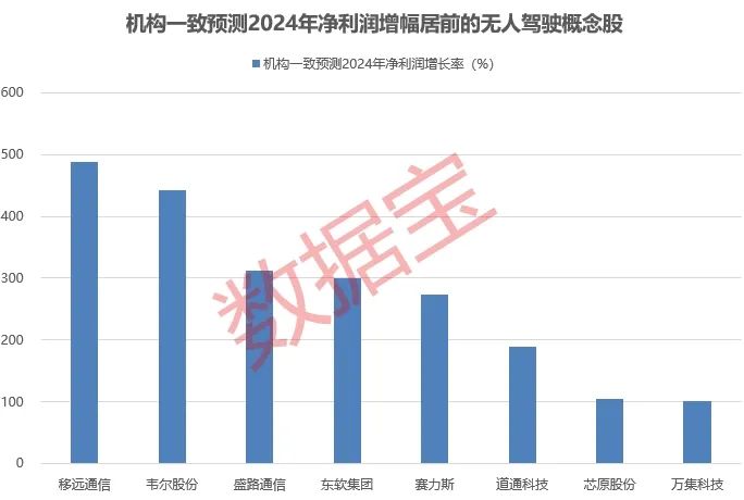 机构普遍看好无人驾驶概念股2024年的业绩表现。根据5家及以上机构一致预测,42只概念股2024年净利润有望实现增长,其中移远通信、韦尔股份、盛路通信等8股预测净利润增幅将在100%以上。