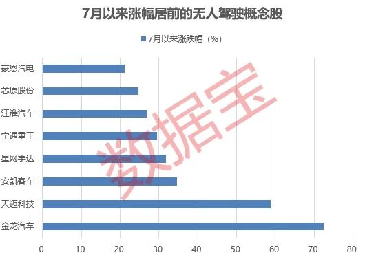 7月以来,无人驾驶概念热度持续上升,多只概念股明显上涨,龙头股金龙汽车累计涨幅高达72.52%居首,天迈科技、安凯客车、星网宇达涨幅居前,均在30%以上。