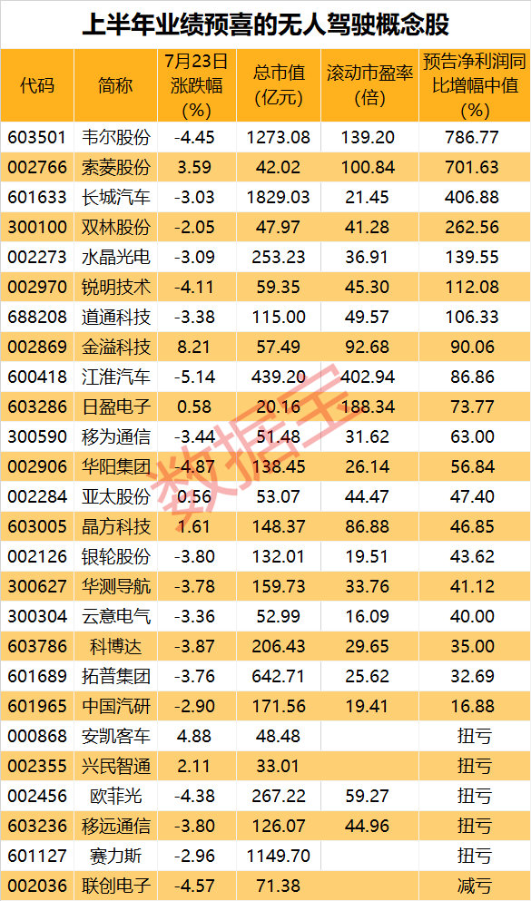 韦尔股份、索菱股份预计增幅最高,上半年净利润同比增幅中值均在700%以上。韦尔股份业绩预告显示,预计实现归母净利润13.08亿元—14.08亿元,同比增加754.11%—819.42%。上半年,伴随着公司在高端智能手机市场的产品导入及汽车市场自动驾驶应用的持续渗透,公司的营业收入实现了明显增长。