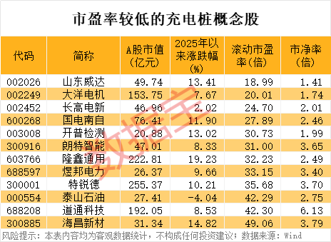 从估值水平来看,上述业绩预增的充电桩概念股中,截至2月25日收盘,4股滚动市盈率低于30倍,分别是山东威达、大洋电机、长高电新、国电南自。此外,11股市净率低于2倍,包括韶能股份、新联电子、南京公用、山东威达、广电电气等。