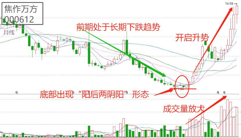 除了日线图之外,“阳后双阴阳”形态也同样适用于月线图中。我们来看上面两幅图是焦作万方的月线走势图,前期一直处于长期的下跌趋势中,在底部出现“阳后双阴阳”形态后,伴随着成交量的放大,该股开启了长达2年的牛市,股价翻了10倍,当然,这也切合了当时市场的大牛行情。