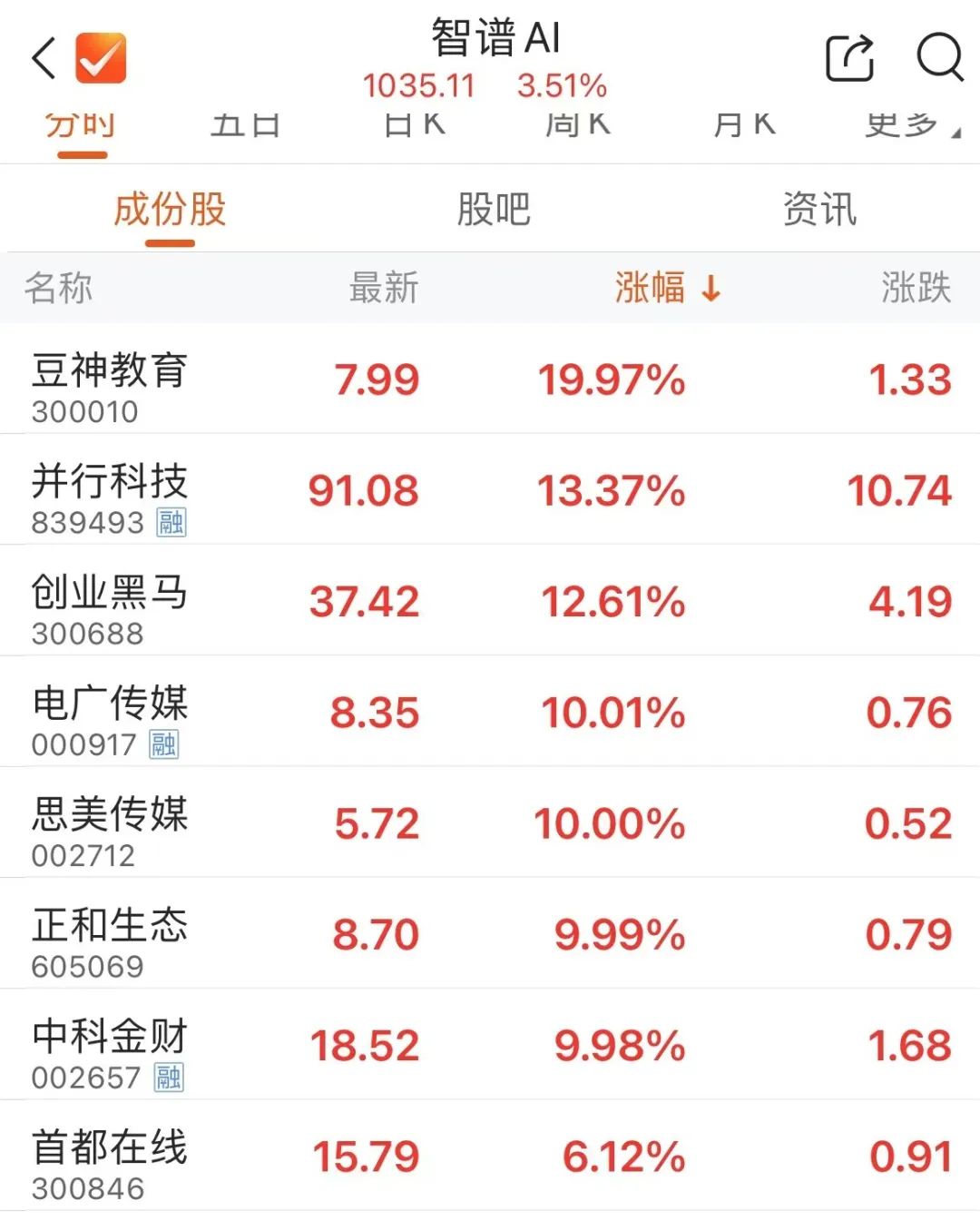 今日早盘,智谱AI概念股再度爆发。截至午间收盘,豆神教育以20%幅度涨停,并行科技、创业黑马涨超10%,电广传媒、思美传媒、正和生态、中科金财等涨停。