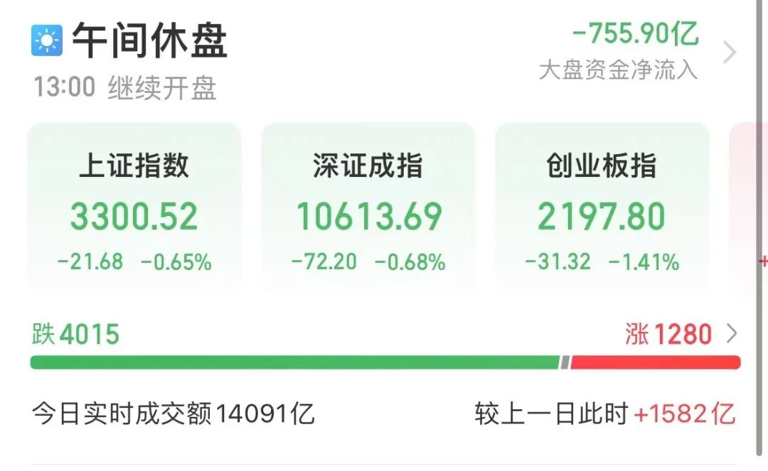 周二早盘,A股震荡调整,创业板指较弱。截至午间收盘,上证指数跌0.65%,深证成指跌0.68%,创业板指跌1.41%。A股半日成交额为1.41万亿元,较上个交易日同期放量1582亿元。