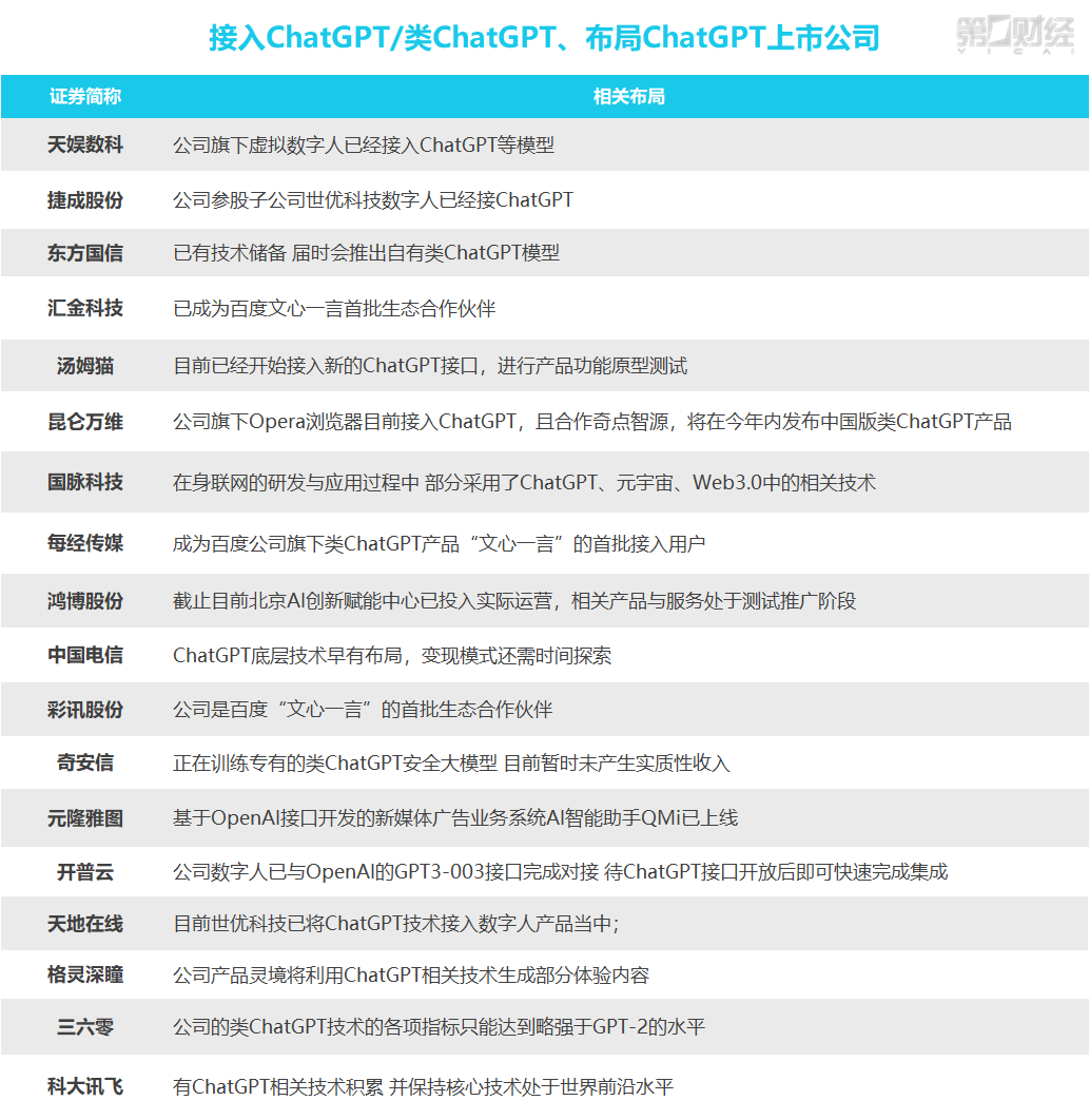 据一财不完全统计,截至今年3月初,A股已有近20家上市公司宣布相关业务已经接入类似ChatGPT技术,或正在研究相关技术与数字人结合的应用场景。