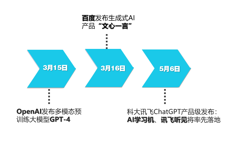 值得关注的是,明日百度的生成式AI产品“文心一言”也将正式发布;科大讯飞的类ChatGPT技术产品发布将于5月6日进行。从目前披露的信息来看,科大讯飞AI学习机、讯飞听见等产品将成为类ChatGPT技术率先落地的产品。