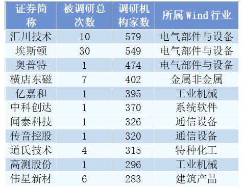 数据显示,工业机械行业、电气部件与设备行业最受机构关注。工业机器人龙头埃斯顿被调研次数最多,达30次。参与汇川技术调研的机构家数最多,达579家。