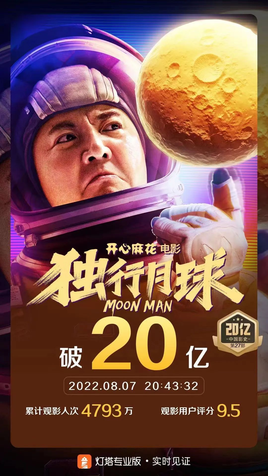 据灯塔专业版实时数据,截至8月7日20时43分,影片《独行月球》票房突破20亿,成为中国影史第27部20亿票房影片。