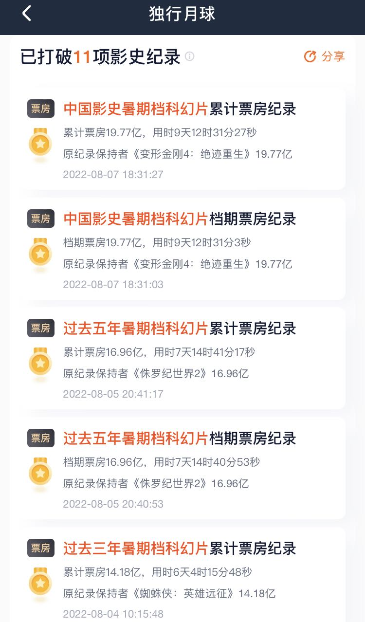 《独行月球》强劲的票房打破了多项影史纪录。灯塔专业版数据显示,《独行月球》目前已经打破包括中国影史暑期档科幻片累计票房、中国影史国产片首映日场次等在内的11项纪录。
