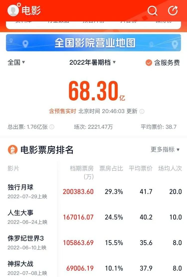 根据灯塔专业版数据,截至8月7日20:46,2022年暑期档总票房已突破68亿元。