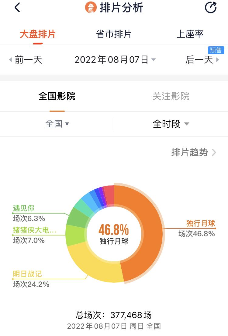 “沈马组合”表现不俗,《独行月球》7月29日上映后便一骑绝尘,连续10天占据日票房冠军位置,日均票房近2亿元。截至8月7日晚,《独行月球》累计观影人次达4742万。在排片方面,《独行月球》颇受院线青睐,排片占比接近“半壁江山”,8月7日达到46.8%,第二名《明日战记》仅为24.2%。