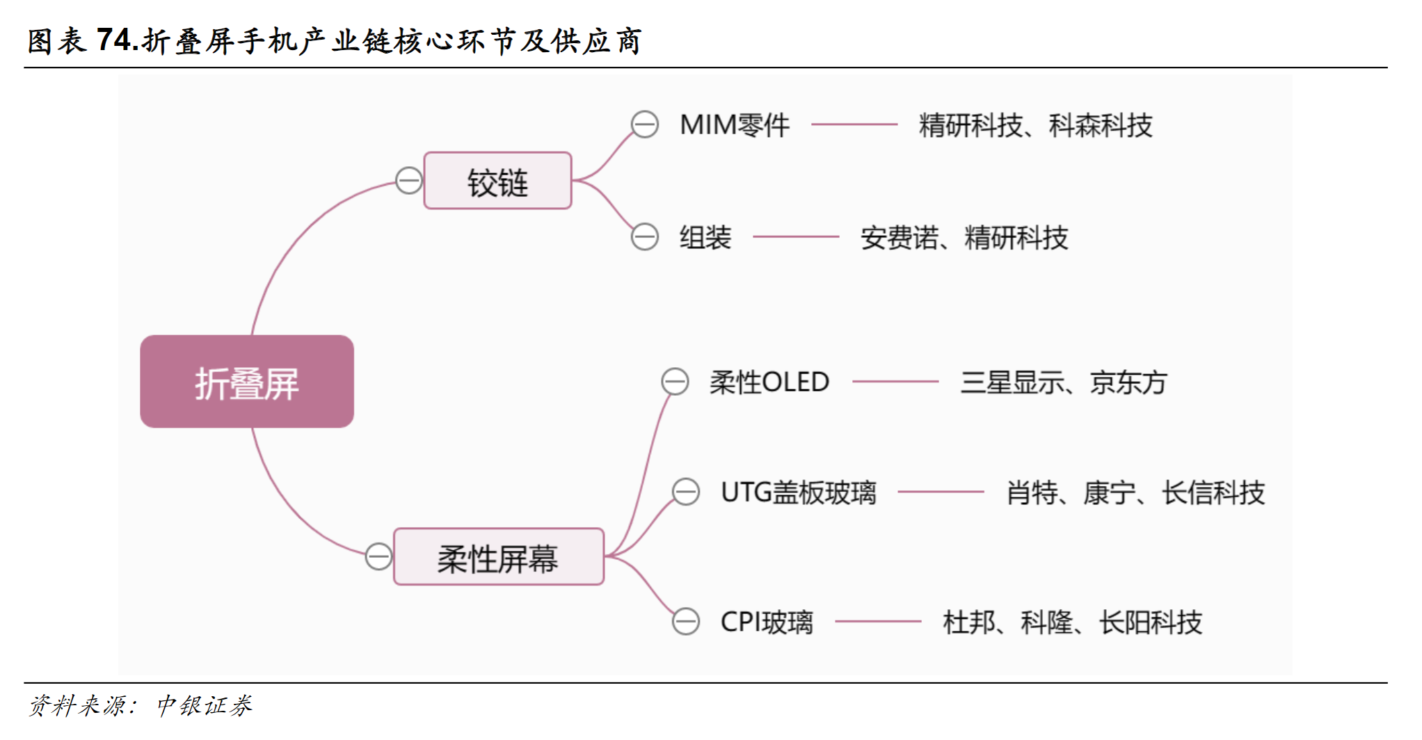 一开一合,折叠的形态,满足了消费者不同场景下的使用需求。分析人士指出,全新的技术规格以及更高的要求,也是国产供应链的一次升级和突围。从折叠屏手机的发展进程来看,早期的供应链主要集中在海外。不过,随着国产折叠屏手机的崛起,本土供应链企业也加快了扩张的步伐,折叠屏供应链的本土替代正在加速。中银证券指出,折叠屏手机产业链核心环节主要为铰链和柔性屏幕。具体来看,在MIM零件领域的上市公司有精研科技、科森科技,组装领域的企业有精研科技。在柔性OLED领域的上市公司有京东方,UTG盖板玻璃领域的企业有长信科技,在CPI玻璃领域的上市公司有长阳科技。