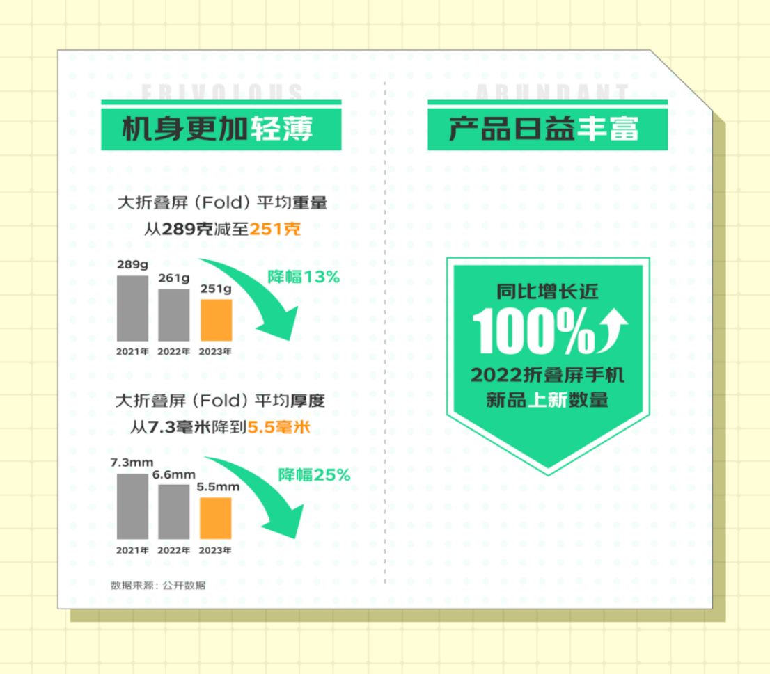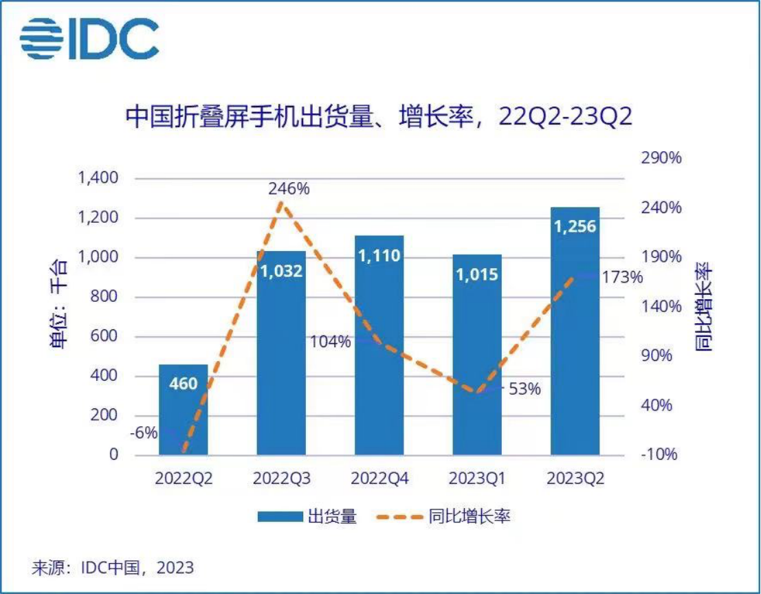 进入到2023年,折叠屏也已经历经四年多迭代发展,从最初的战略意义进入到真正的使用价值阶段。在今年上半年手机行业整体遇冷的情况下,折叠屏手机却出现了逆势增长的趋势。据IDC最新报告显示,2023年第二季度,中国折叠屏手机市场出货量约126万台,同比增长173.0%;上半年出货227万台,同比增长102.0%。据Sandalwood中国电商市场监测,2023年上半年折叠屏手机的总销量达到48万部,同比增长78%,预计到2023年底,国内折叠屏手机的销量将超过百万部。相比较需求低迷的整体智能机市场,折叠屏赛道可谓尤其火热。