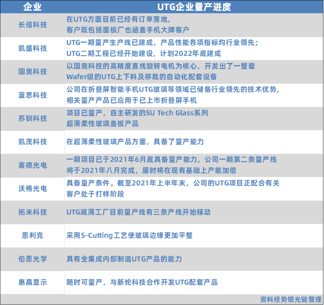 另外,柔性屏幕盖板材料升级,UTG玻璃脱颖而出。在盖板材料这块,UTG已经逐渐取代CPI成为折叠屏市场的主流。据有关媒体整理,有布局UTG相关业务的上市公司为长信科技、凯盛科技、蓝思科技、沃格光电,具体业务如下表。目前,在UTG技术上,主要是肖特、康宁之类的国外厂商掌握,其中肖特在去年的市占率高达47%。不过,诸如凯盛科技、长信科技等国产厂商也在提速。中金公司在去年曾指出,国内厂商UTG产能正在扩张加速,并且由二次减薄加工向一次成型布局。7月底,凯盛科技在投资者互动平台表示,公司UTG有小批量订单出货并已在相关终端手机上应用,同时公司也正与多个客户进行全面对接,加快推进UTG及UTG迭代产品进一步市场化。