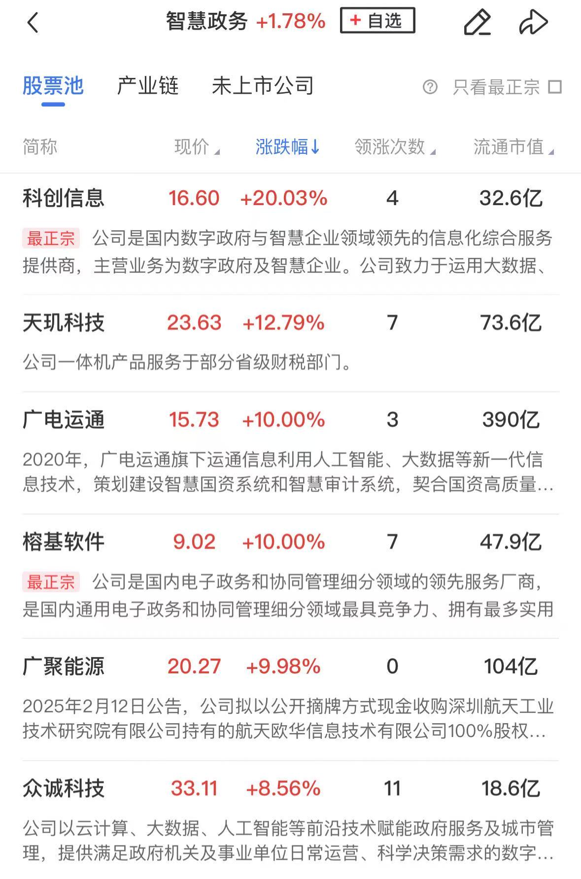 智慧政务在盘中走强,科创信息、榕基软件、广电运通涨停,天玑科技、众诚科技、国泰集团、数字政通、云从科技等个股涨幅居前。