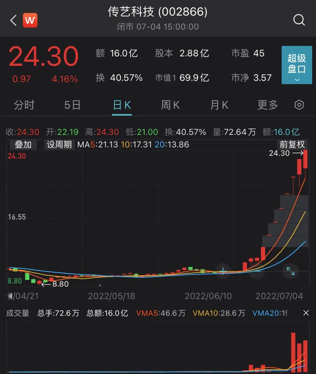 7月4日,传艺科技股价一度跌停,午后翻红。截至收盘,公司股价24.3元/股,涨幅为4.16%。