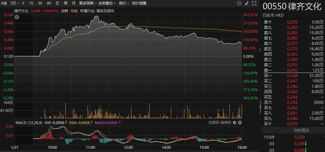 港股律齐文化今日大幅高开高走,盘中一度暴涨逾341%,截至收盘,涨幅回落至108%,成交较昨日激增逾1700多倍。