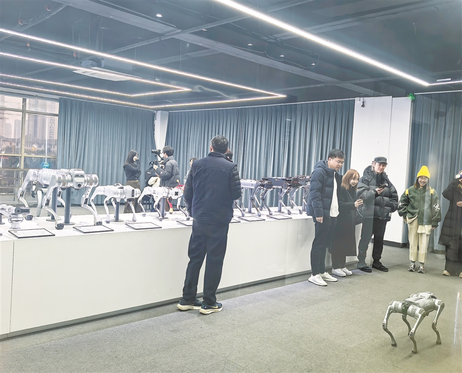 与DeepSeek高大上的办公环境不同,宇树科技显得颇为不起眼,同一栋大楼的标识牌上,一边是宇树科技,另一边是另一家机器人公司。记者到达时,宇树科技工作人员正在演示四足机器人的强大功能,展厅陈列着不同型号的机器人。