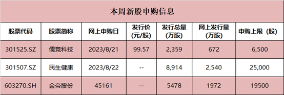 根据发行安排,儒竞科技将于本周一申购,公司发行价为99.57元/股,中一签需缴款4.98万元;民生健康将于周二申购,金帝股份将于周三申购。