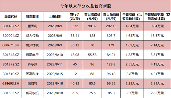 以首日收盘价计算,盟固利、威力传动的单签收益均超过了4.6万元,固高科技单签收益达2.8万元,科净源、锴威特、威马农机的单签收益均超过了2万元。以首日盘中最高价计算,威力传动单签盈利达13.5万元,盟固利单签盈利近10万元,科净源、固高科技单签盈利均超过了4万元。