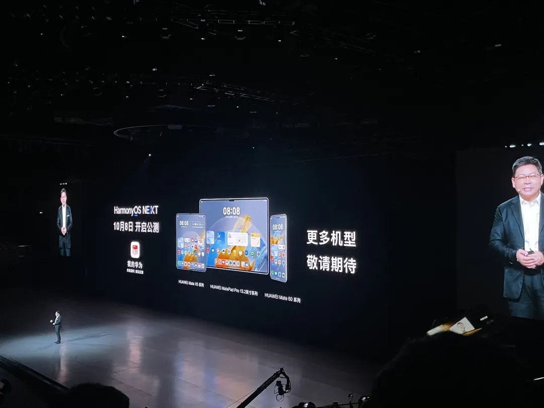 在9月24日举行的华为秋季全场景新品发布会上,余承东最新透露,华为HarmonyOS NEXT将于10月8日正式开启公测,首批公测机型包括华为Mate 60系列、Mate X5系列和MatePad Pro 13.2系列,消费者可通过“我的华为”APP-“升级尝鲜”申请升级。