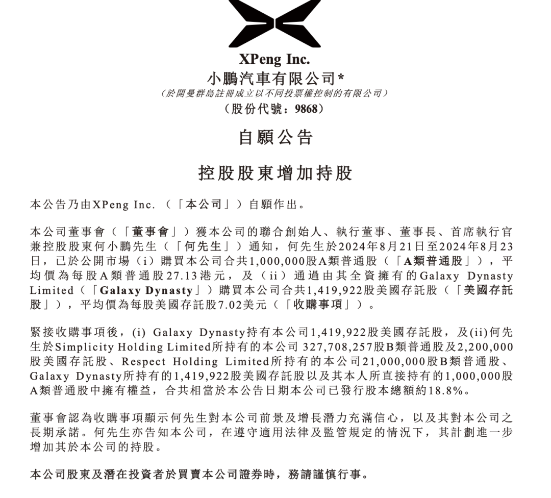 公告称,何小鹏表示,在遵守适用法律及监管规定的情况下,计划进一步增加其于小鹏汽车的持股。