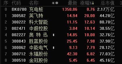消息发酵后,充电桩板块迅速拉升,奥特迅拉升封板,截至发稿,中超控股、英飞特涨停,科大智能涨超12%,星云股份、金冠股份、中能电气等也实现较大涨幅。