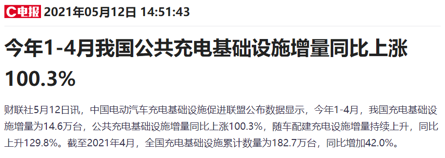 充电桩的建设与推广切合年后以来持续的“碳中和”主线。为实现碳中和、碳达峰的目标,充电桩上游新能源车行业自去年下半年来也持续高增。在四月,中国新能源车继续同比维持高增成长,表现好于行业。2021年以来,车联网和充电桩(站)布局应用也在获得加速推动。今年前四个月,我国公共充电基础设施增量同比上涨了100.3%。从充电电量来看,2021年4月全国公共充电桩充电电量达83.7亿kWh,环比增长13.6%,同比高增89%。