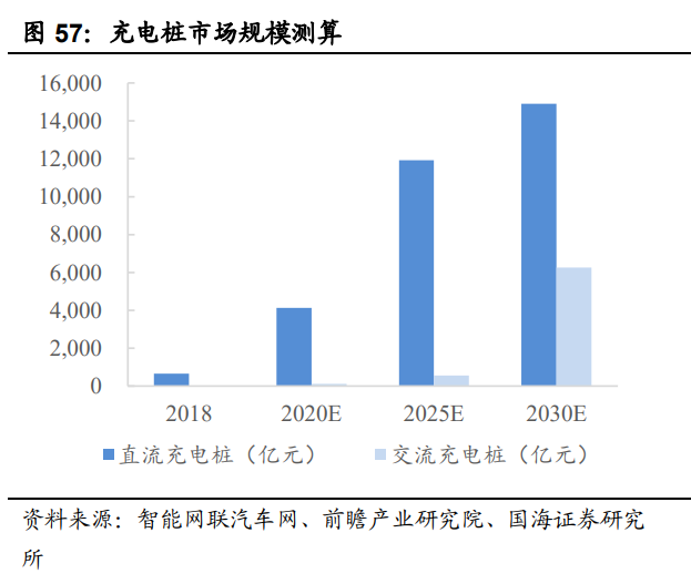 目前,东部沿海地区仍为公共充电基础设施的主要建设区域,前十名省份充电桩数量占比达72.07%。机构估算,预计到2025年全国充电桩数量将达到1510万个,到2030年将达到4970万个,2018-2030年复合增长率将达到41%,其中直流充电桩的占比将从18%提升至30%。