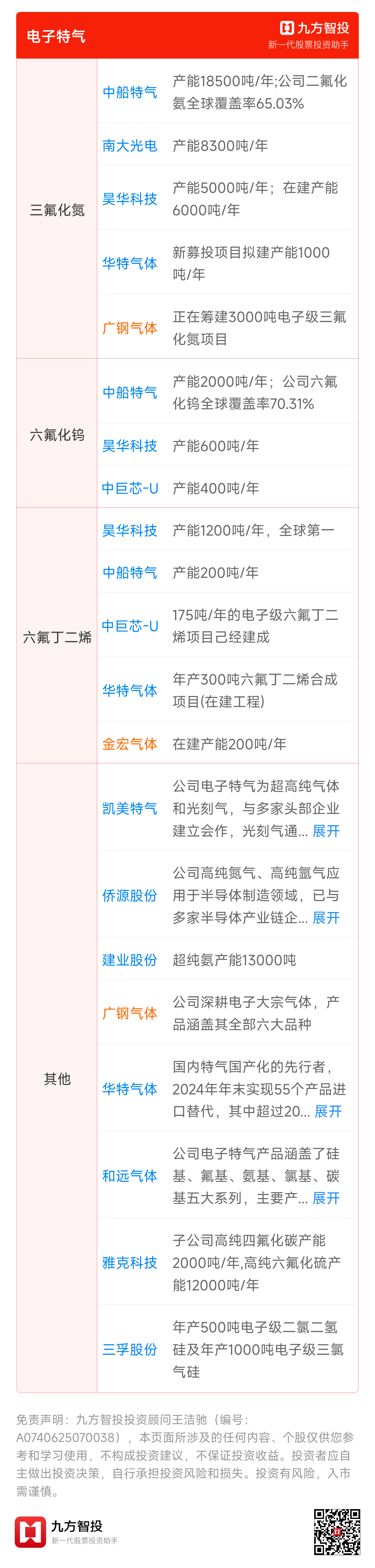 市场热点方面,工业气体概念股全天保持强势,午后进一步上攻,板块指数创出历史新高。蜀道装备(300540)中午开盘后快速20%涨停,华特气体、华谊集团等涨停或涨超10%。