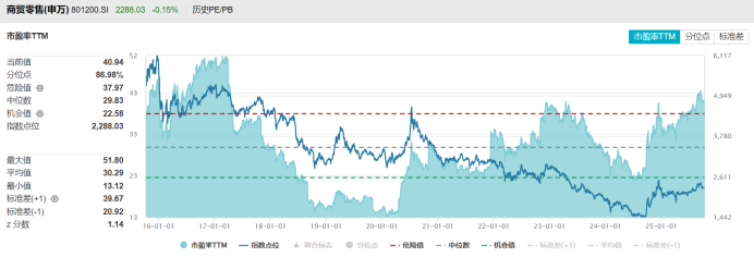 从估值层面来看,截至10月10日数据,商贸零售(申万一级)指数目前市盈率40.94倍,处于近十年86.98%分位点;市净率1.95倍,处于近十年58.17%分位点。此前9月中旬,商贸零售指数市盈率一度升至43.58倍,创2017年4月以来近8年新高。