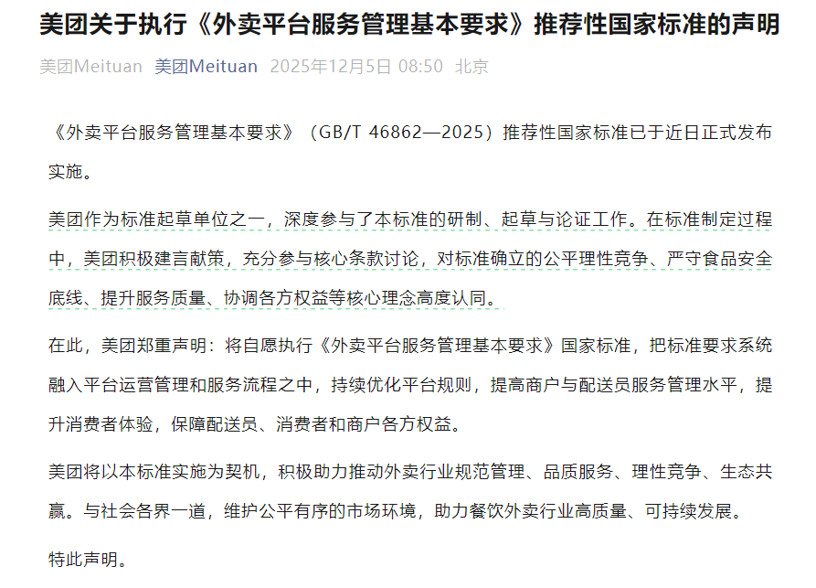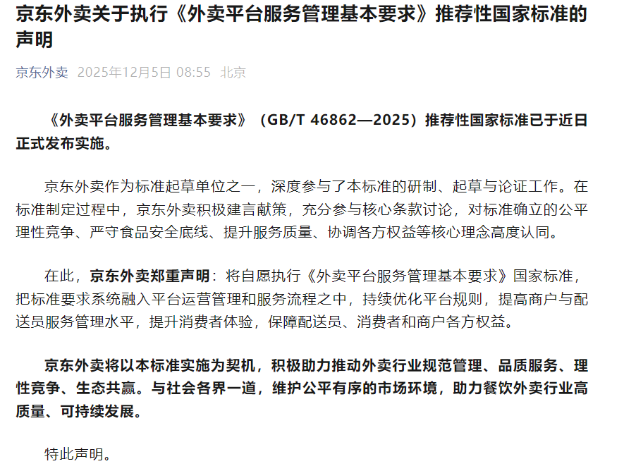 近日淘宝闪购、美团、京东外卖分别发表声明:公司将自愿执行《外卖平台服务管理基本要求》国家标准,把标准要求系统融入平台运营管理和服务流程之中,持续优化平台规则,提高商户与配送员服务管理水平,提升消费者体验,保障配送员、消费者和商户各方权益。