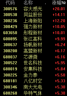 今天上午,芯片概念整体表现活跃。昨天下午爆发的光刻胶板块,今天上午继续大涨,容大感光再度20%涨停,迎来两连板。此外,上海新阳、同益股份等个股涨幅也较为显著。