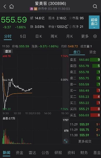 今天上午,爱美客走势跌宕起伏,引人关注。爱美客集合竞价高开3.37%,之后直线下跌,一度跌超7%,随后又快速拉升,股价翻红,而后又震荡回落,截至午间收盘下跌1.66%,最新市值为1202亿元。