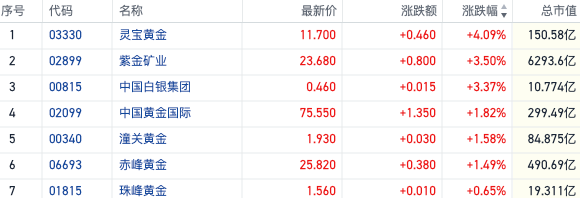 截至发稿,今日紫金矿业(02899.HK)、灵宝黄金(03330.HK)双双涨超3%,且均刷新历史高点,招金矿业(01818.HK)等个股也跟涨。