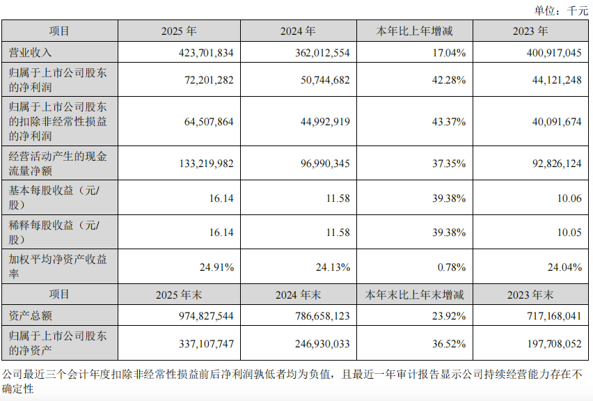 年报显示,2025年,宁德时代营业收入4237亿元,同比增长17%;净利润722亿元,同比增长42.28%,经营活动产生的现金流量净额1332亿元,同比增长37.35%,拟按每10股69.57元(含税)的比例,向全体股东现金分红。