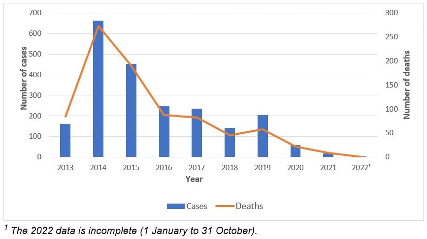 根据世界卫生组织的数据,在2012年4月至2022年10月期间,全球向世卫组织报告了2,600例经实验室确诊的病例和935例相关死亡病例。这意味着,约有35%MERS患者已经死亡。