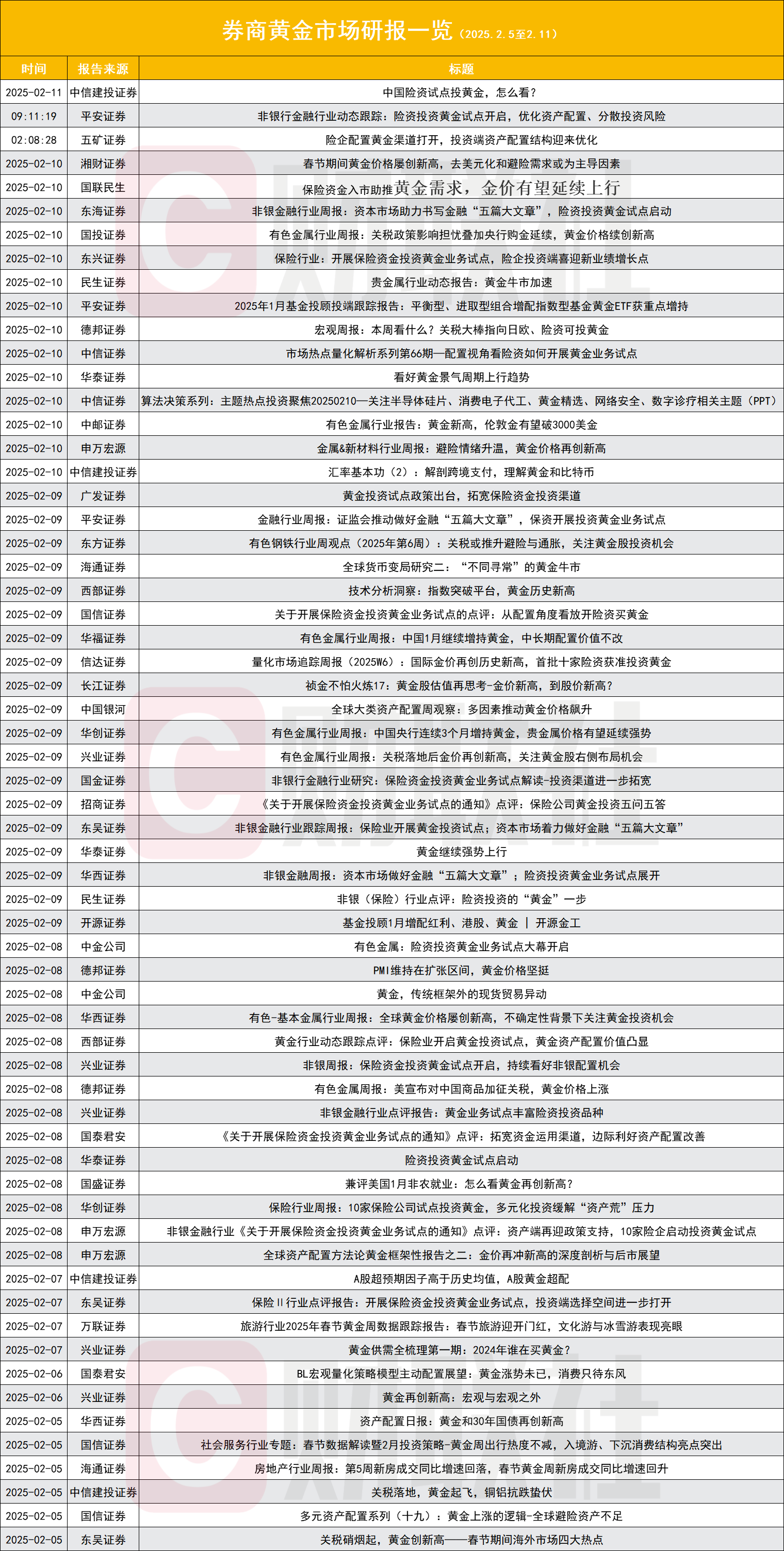 自2月5日A股开盘以来,券商对黄金市场的关注度显著提升。截至2月11日,近7个自然日内,31家券商研究所共发布了62份黄金相关研报。