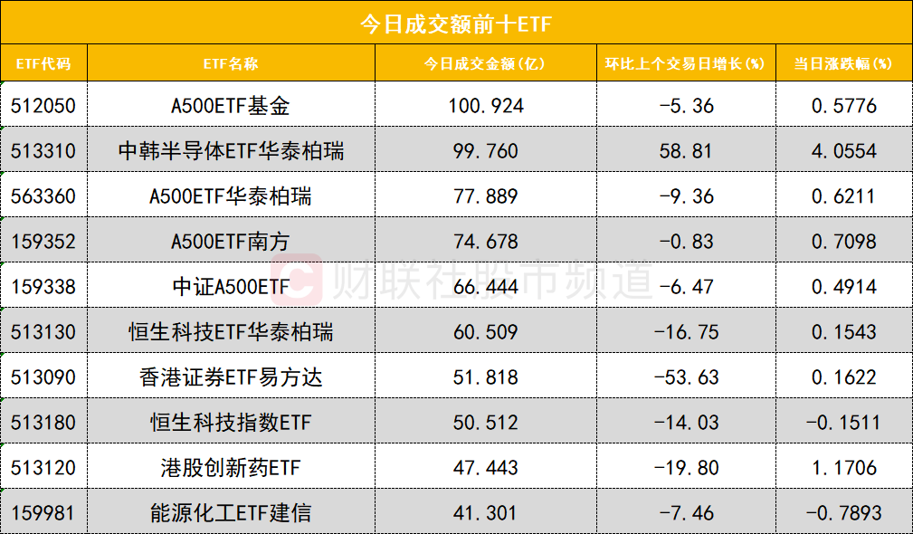 从成交额前十的ETF来看,A500ETF基金(512050)成交额位居首位,中韩半导体ETF华泰柏瑞(513310)成交额位居次席。