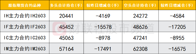 四大期指主力合约中,IH、IF、IC、IM合约多空双方均减仓,IF合约空头减仓数量较多。
