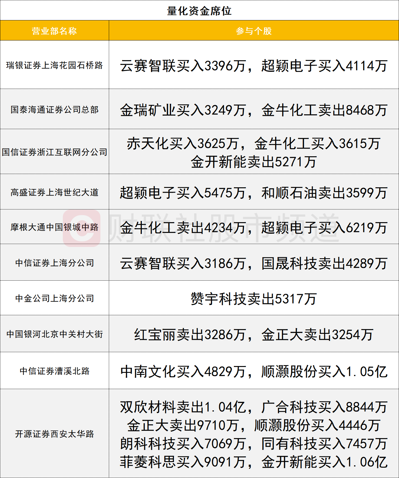 量化资金活跃度较高,存储芯片概念反复活跃,朗科科技走出3天2板,获一家量化资金(开源证券西安太华路)买入0.7亿。金开新能获该席位买入1.06亿。商业航天概念股顺灏股份今日涨停,获两家量化资金(中信证券上海漕溪北路、开源证券西安太华路)合计买入1.49亿。